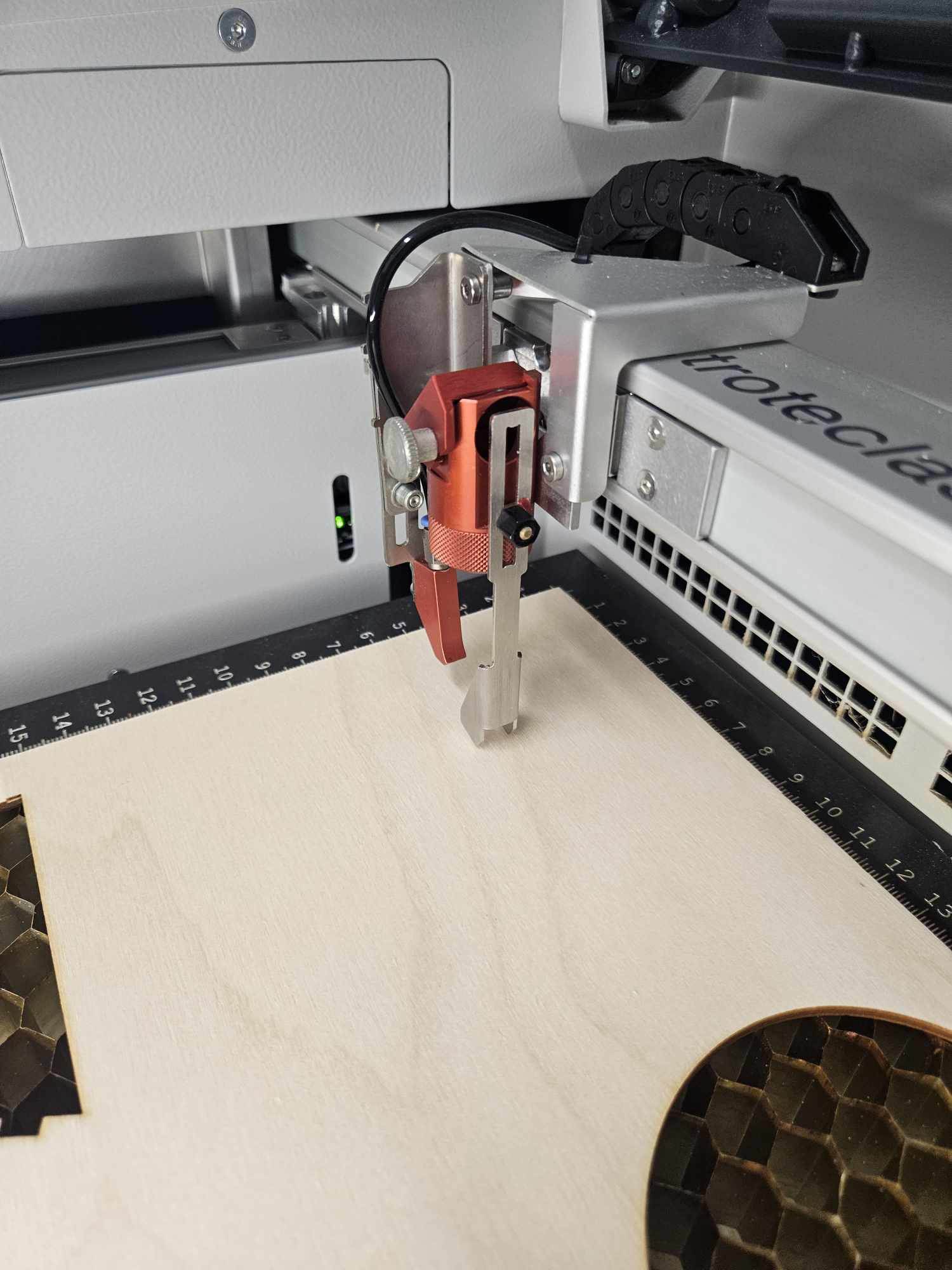 → podjechać stołem do góry używając strzałek w osi Z, trzeba użyć do tego takiego fifaczka jak na zdjęciu poniżej, podjechać stołem aż ten fifaczek samoistnie spadnie, wtedy mamy odpowiednią wysokość od dyszy do materiału