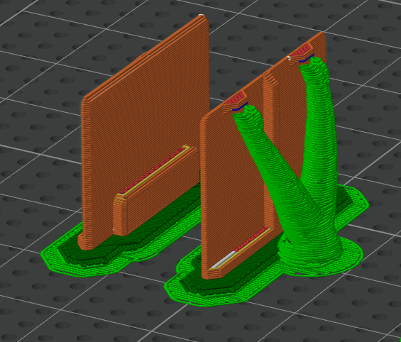 → Na pierwszym wydruku próbnym zrobiłam tylko przegródki do kart microSD, obudowę i kolejne przegródki zrobiłam później na Creality K1C. Cały czas coś jest nie tak z wydrukami tych przegródek - jak nie warping to łamią się, itd. Próbowałam też na poziomo drukować, to w ogóle nie wyszły. Lepiej w pionie jednak. Te przegródki jak są w pionie to nie potrzebują supportów.